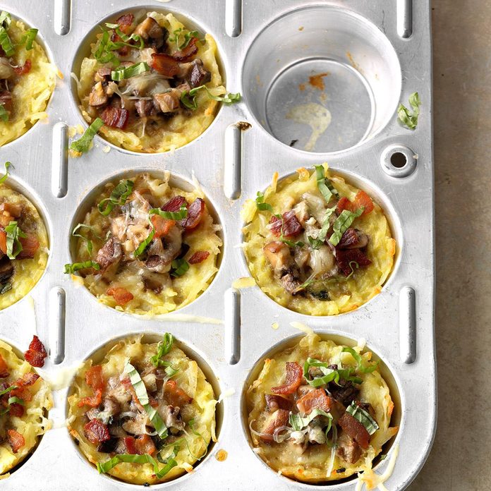Hash browns make a fabulous crust for these individual egg quiches. They look fancy but are actually easy to make. They’ve been a hit at holiday brunches and other special occasions.—Kate Meyer, Brentwood, Tennessee