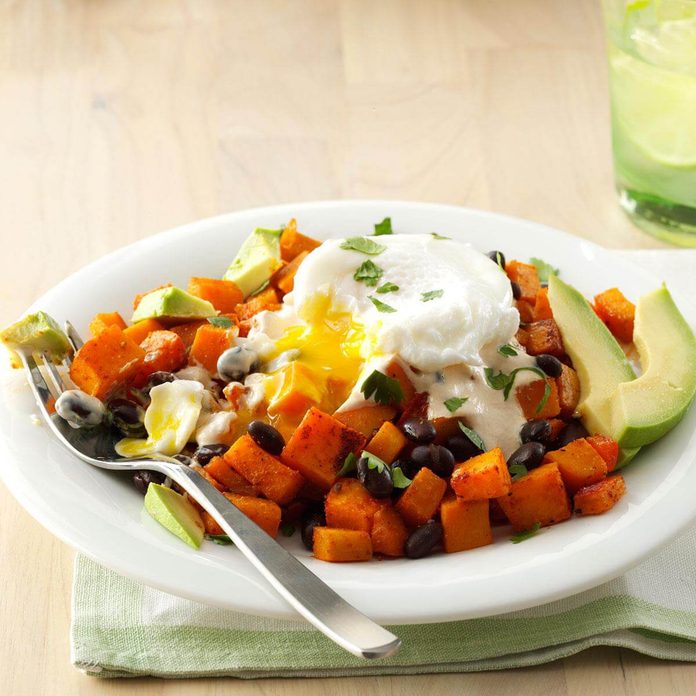 Adobo sauce adds so much extra flavor that you won’t even miss the smaller amounts of butter and egg yolks in this smoky hash. Here’s a tip: Add a splash of white vinegar to the poaching water right before you drop in the eggs. It helps keep them from separating as they cook. —Brooke Keller, Lexington, Kentucky