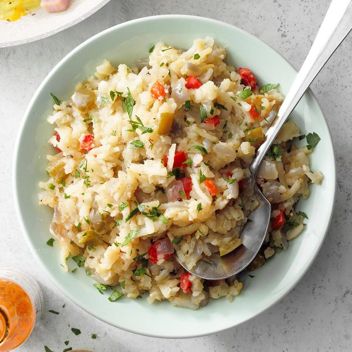 This simple slow-cooker side dish dresses up a bag of frozen hash browns with a smattering of peppers, onions and herbs. Serve with hot sauce for southwestern-inspired flavor.