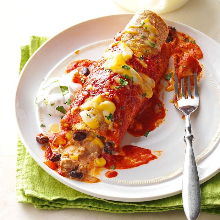 My best friend and I created this recipe together because we wanted a meal that’s easy to prepare, affordable and nutritious. We both have hectic schedules, so when we’re feeling crunched for time, it’s a relief to have these wholesome enchiladas waiting for us in the freezer. —Holly Baber, Seattle, Washington