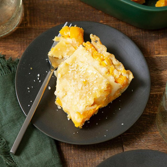 My rich, saucy lasagna features winter squash at its finest. The whipped cream topping adds a unique twist to this meatless casserole packed with roasted butternut squash, two kinds of cheese and a host of seasonings. Allowing the lasagna to stand for 10 to 15 minutes before serving makes it easier to cut. —Lisa Sheets, Carmel, Indiana