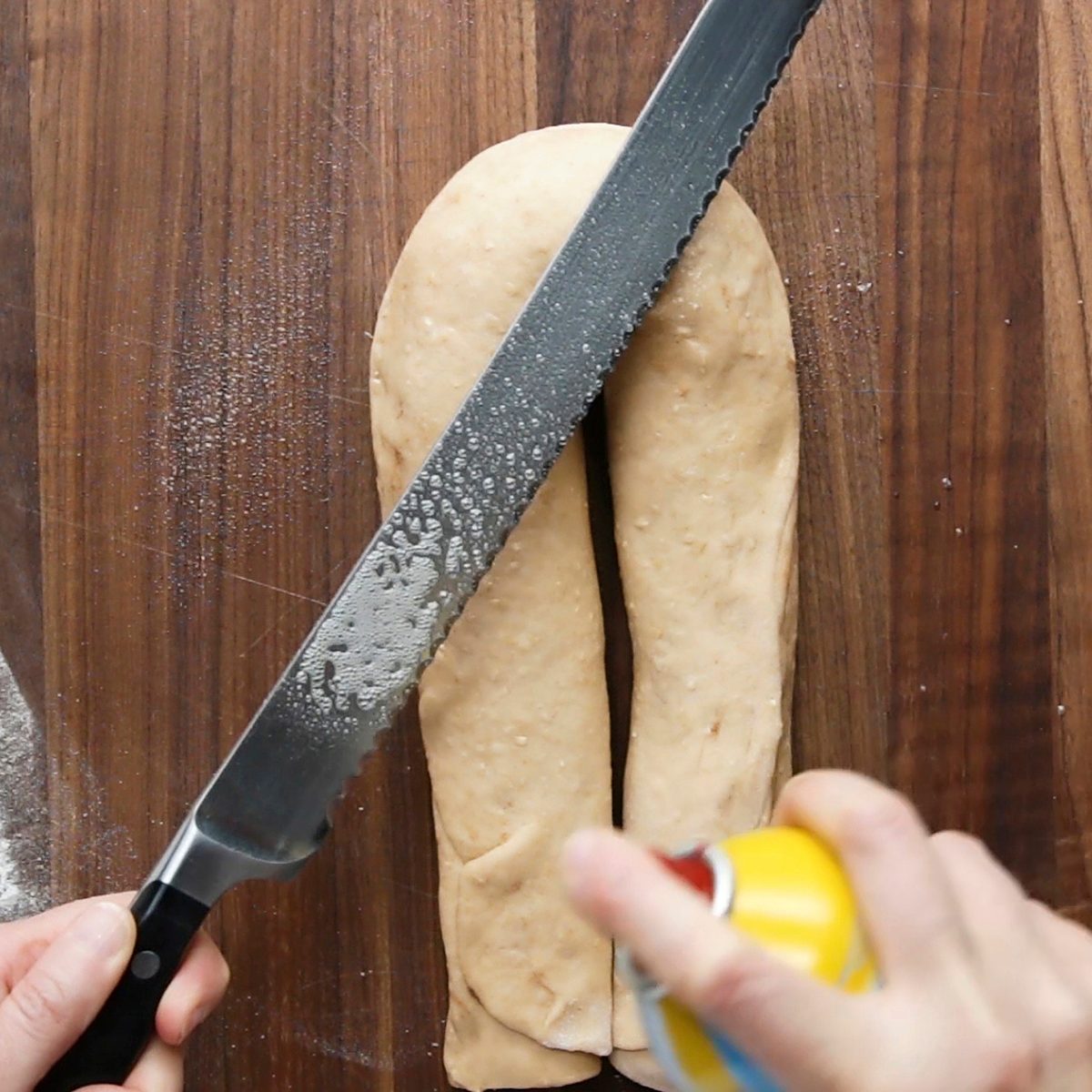 To create precise knife cuts in cinnamon rolls, twisted breads and other decorative doughs, spray a serrated knife with cooking spray before cutting.