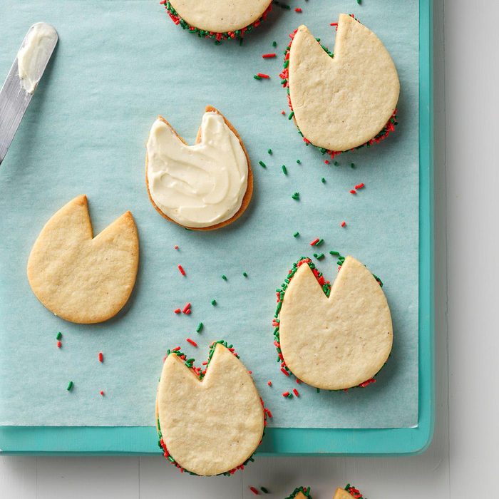 This is the first cookie recipe I’ve ever created! It captures the essence of the holidays because there’s a trace of eggnog flavor in these adorable reindeer hoof prints. You can add red and green frosting to make them even more Christmasy or use brown sprinkles for a more natural reindeer look. —Pam Sano, Voorhees, New Jersey