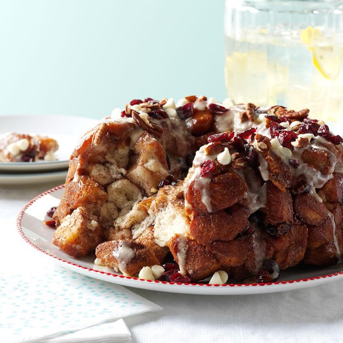 Monkey bread is no stranger at our house, but I wanted a holiday version. This eggnog dessert with cranberries is a breakfast treat or knockout dessert. —Katherine Wollgast, Florissant, MO