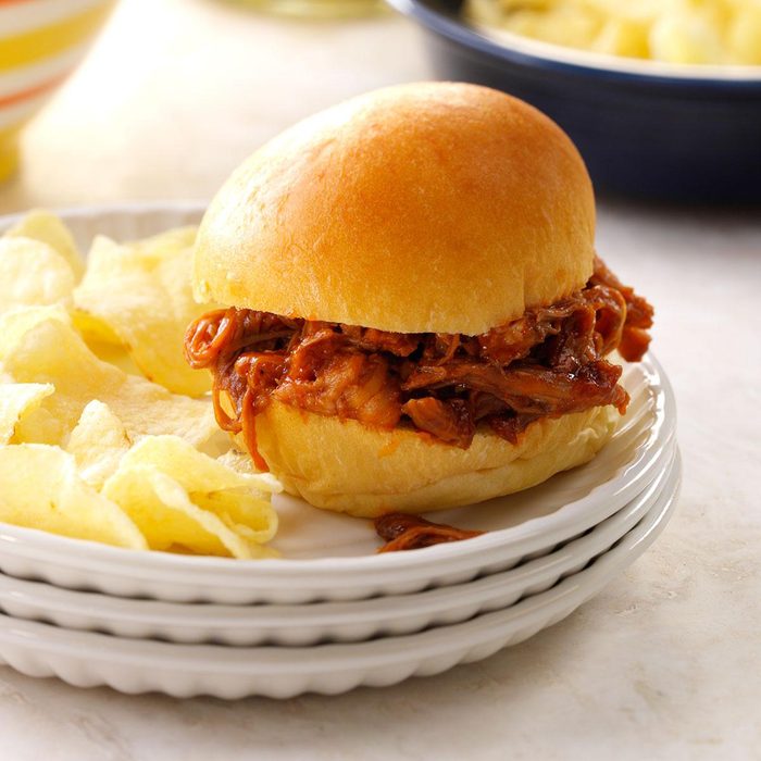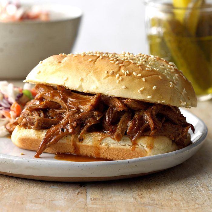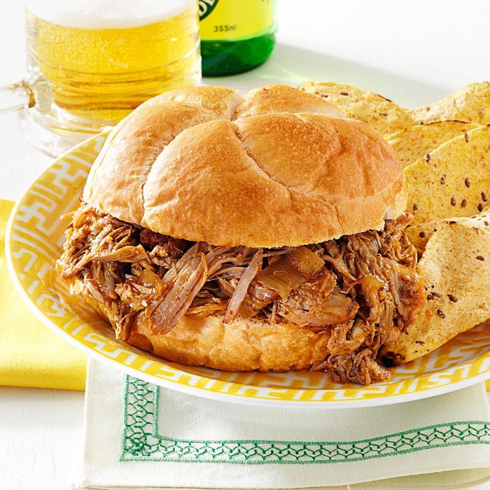 A boneless beef roast simmers for hours in a slightly sweet sauce before it's shredded and tucked into rolls to make hearty sandwiches. This is a family favorite. —Jennifer Bauer, Lansing, Michigan