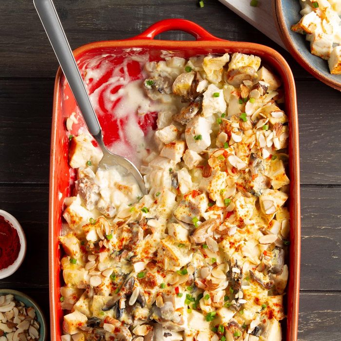 After I tasted this hot chicken hot dish at a women’s luncheon, I left with the recipe in hand. I was our city clerk for several years, and on election days I brought this to serve our poll workers for lunch. It got everyone’s vote of approval! I’ve found it is also delicious stuffed in a tomato. —Ruth Glabe, Oronoco, Minnesota