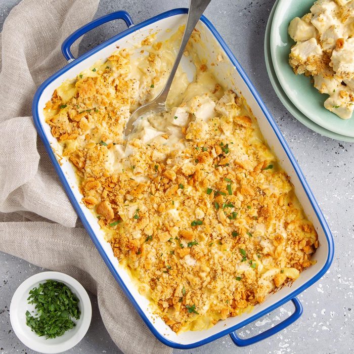 I never bring home leftovers whenever I take this creamy chicken casserole with Ritz crackers to a potluck. Its mild flavor has broad appeal. I especially like the way that the crumb topping adds a bit of crunch to each meaty serving. —Faye Hintz, Springfield, Missouri