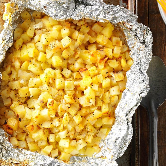 Since my husband and I love to grill meats, we're always looking for easy side dishes that cook on the grill, too. So I came up with this simple recipe for hash browns. There are never any leftovers. —Kelly Chastain, Bedford, Indiana