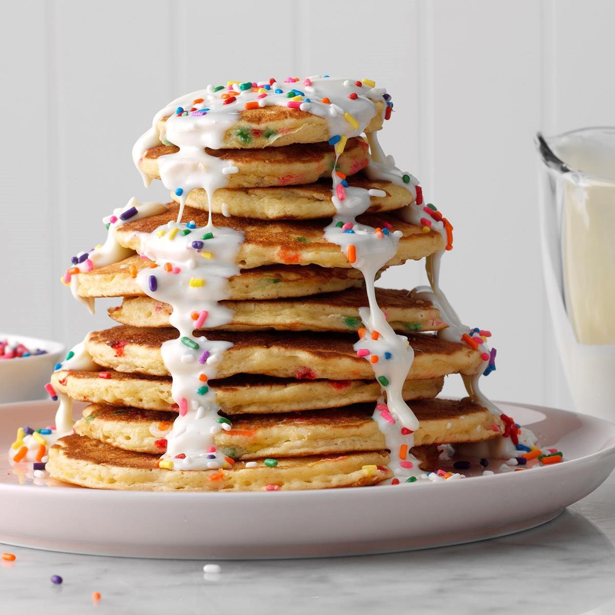 Weekend mornings are special, so celebrate with an array of toppings for your pancake breakfast (you can even try arranging them on a pretty pancake charcuterie board!). Set out a variety of toppings like whipped cream, mini chocolate chips, sprinkles, strawberry sauce or even breakfast cereal.