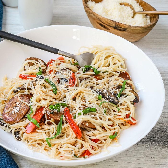 Loaded with sausage, mushrooms, tomatoes and basil flavor, this quick recipe satisfies the toughest critics. It's one of my husband's favorite dishes, and he has no idea it's lower in fat. Add a green salad for a delicious meal. —Ruth Ann Ruddell, Shelby Township, Michigan