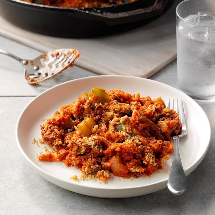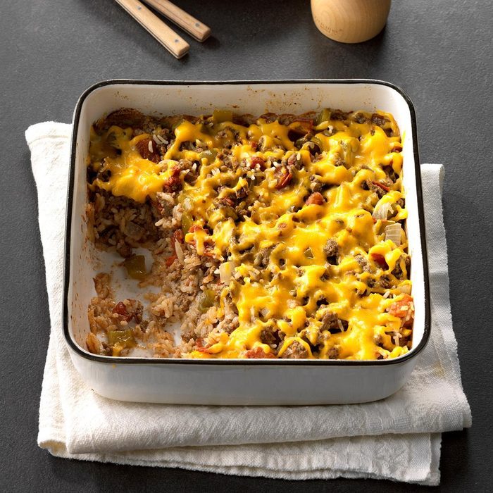 My daughters don’t care for the usual green peppers stuffed with a meat-and-rice mixture, so one of the girls dreamed up this alternative. The peppers are simply chopped and combined with the other ingredients in a casserole. —Darlene Brenden, Salem, Oregon