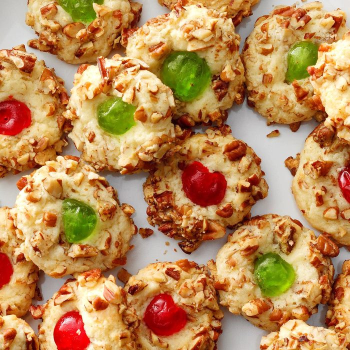 Speckled with chopped nuts and topped with a candied cherry, these tender cookies will disappear fast.—Taste of Home Test Kitchen