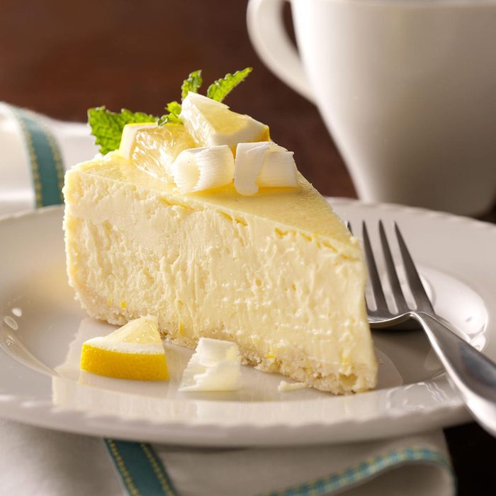 Although it takes some time to prepare this eye-catching cheesecake, the combination of tangy lemon and rich white chocolate is hard to beat. It's always a hit! —Marlene Schollenberger, Bloomington, Indiana