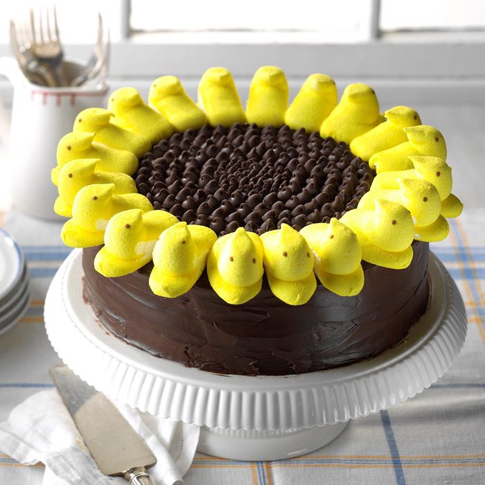 The inspiration for this cake came from one of my favorite flowers, the sunflower. The yellow peeps make eye-catching flower petals, and I carefully placed chocolate chips in a circular pattern to resemble the seeds in the middle of a sunflower. This cake is easy, but looks quite impressive. —Bethany Eledge, Cleveland, Tennessee