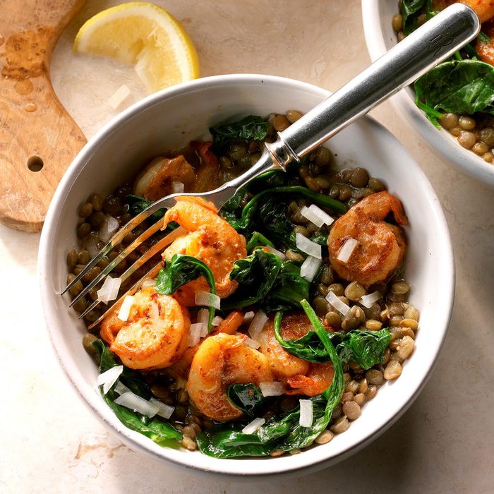 If you have frozen shrimp, a few seasoning ingredients, bagged spinach and lentils on hand in your pantry, you can make this bowl in no time. It’s so delicious, nobody needs to know that it’s healthy, too! —Mary Kay LaBrie, Clermont, Florida