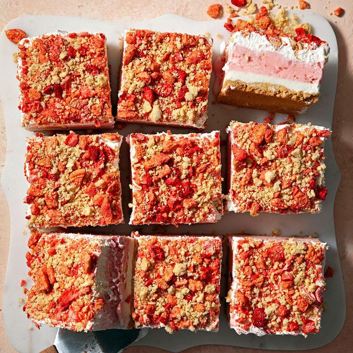 While growing up, I loved treats from the ice cream truck that rolled through my neighborhood. This ice cream cake is inspired by one of those crunchy, strawberry novelties. —Lisa Kaminski, Wauwatosa, Wisconsin