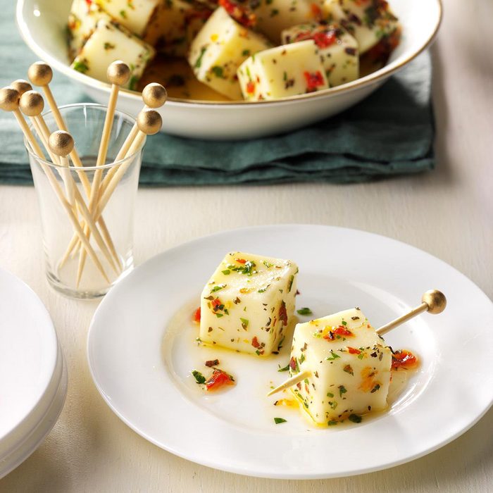 Use your favorite Italian herbs to make this marinated mozzarella. You can make these one-bite appetizers the night before, so you have less to prep the day of your Christmas party. In fact, these are best when marinated overnight!