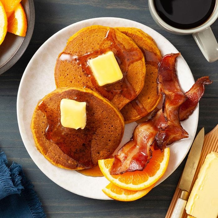 These pumpkin pancakes are also delicious served with butter or whipped topping and a sprinkle of pumpkin pie spice. Freeze any extras in a single layer on a cookie sheet, then store in a freezer bag. They're great fresh out of the toaster! —Mindy Bauknecht, Two Rivers, Wisconsin