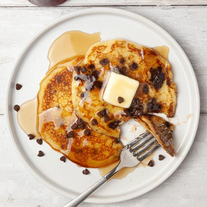 At our house, Saturday morning always means pancakes for breakfast. I make the menu special by servings up stacks of these fluffy buttermilk treats studded with mini chips. —Julianne Johnson, Grove City, Minnesota