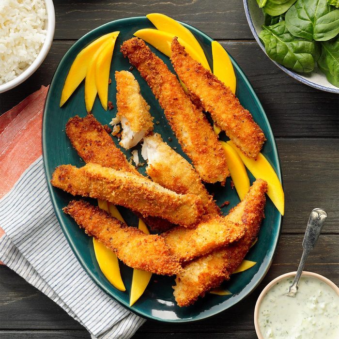 These flavorful Indian-spiced fish sticks please my whole family. Serve them with the creamy dipping sauce. —Jessie Grearson, Falmouth, Maine