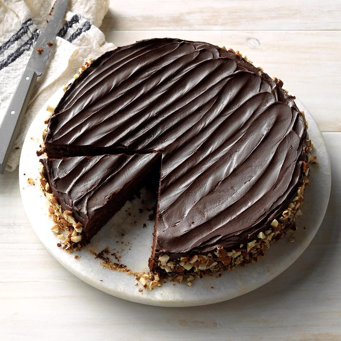 From the Recipe Creator: This decadent triple-layer beauty is pure chocolate indulgence. The cake layers can be frozen prior to final assembly; in fact, they're easier to work with when frozen. —Kathleen Smith, Overland, Missouri