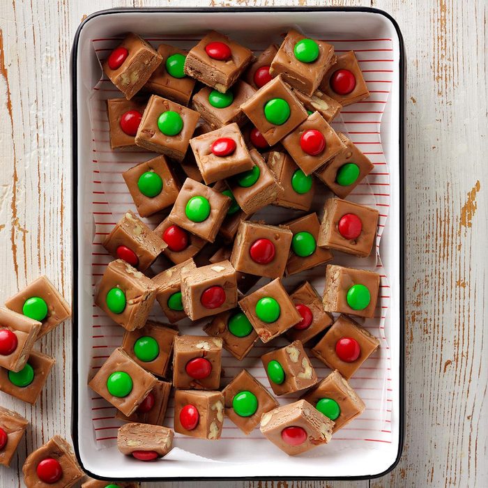 From the Recipe Creator: When my husband came home with 50 pounds of Tootsie Rolls he bought at a discount store, I had to figure out a way to use them—so I came up with this Tootsie Roll fudge recipe! A red or green M&M’s candy atop each piece makes them extra jolly. —Carolyn McDill, Ohatchee, Alabama