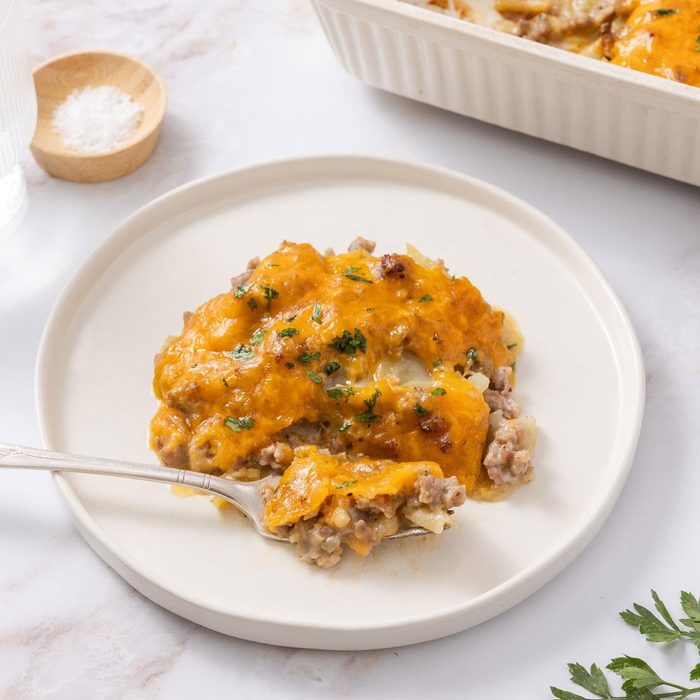 For this all-in-one breakfast casserole, I sandwich pork sausage between layers of hash browns flavored with creamy soup and French onion dip. Cheddar cheese tops it all off. —Esther Wrinkles, Vanzant, Missouri