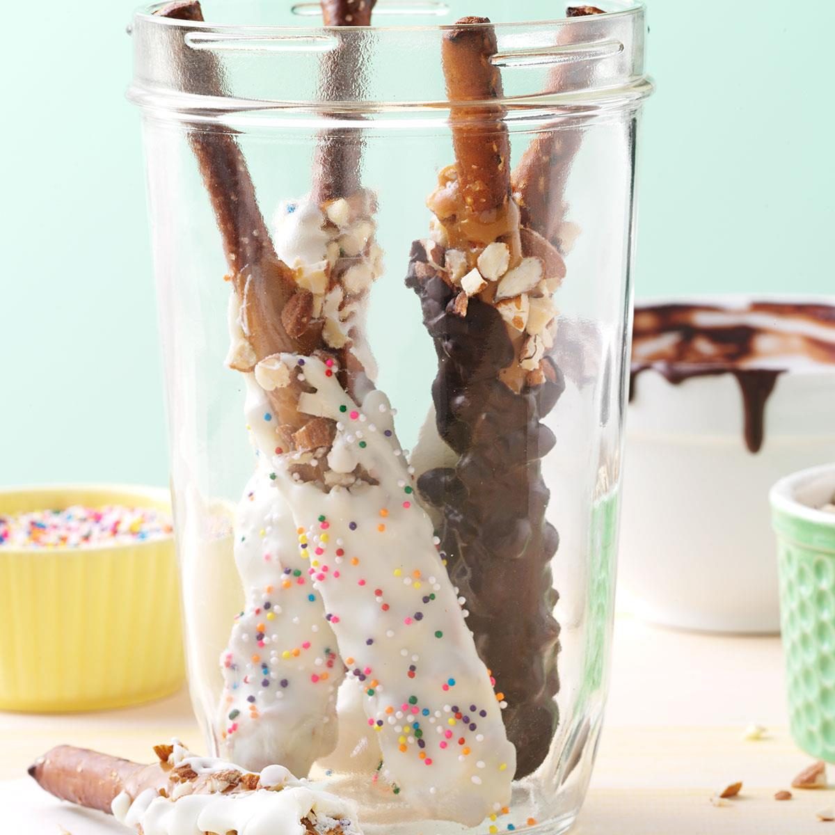 Curb dad’s sweet tooth with these chocolate-covered pretzel rods. An adult should supervise the melting, but kids can have lots of fun rolling the rods in dad’s favorite toppings.
