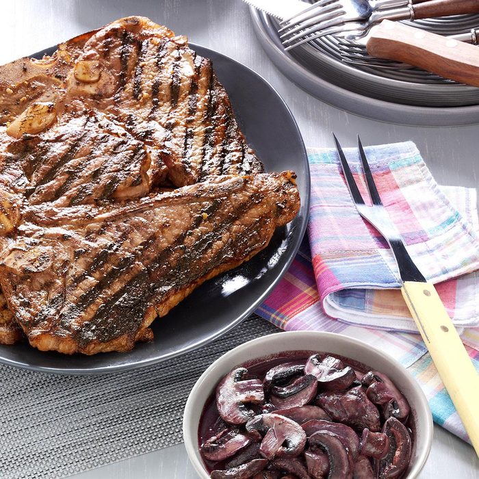 Garlic-Rubbed T-Bones with Burgundy Mushrooms