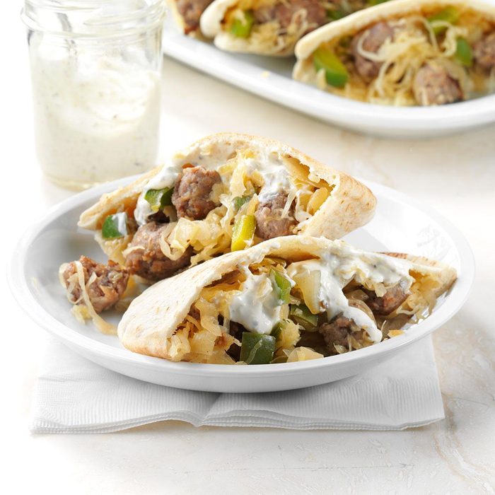 Every August, our town hosts a Bratwurst Festival. To celebrate the sausage season, we stuff brats and sauerkraut inside pita bread. —Brooke Young, Bucyrus, OH