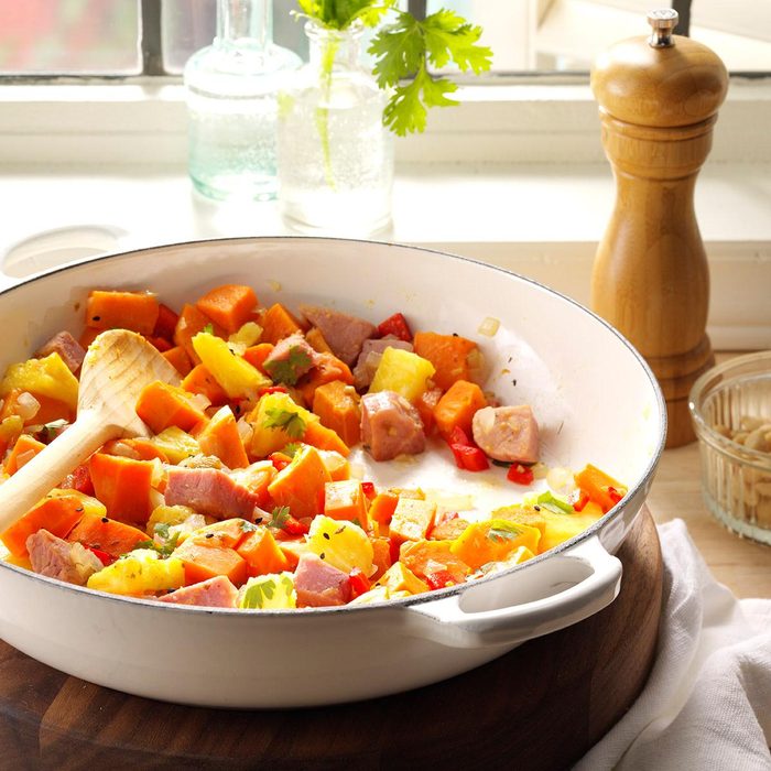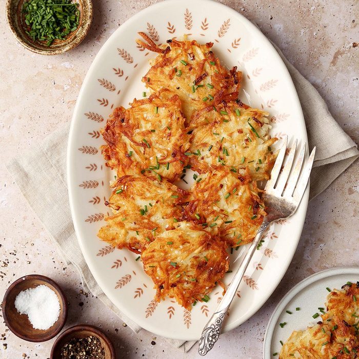 The trick to getting the crispiest breakfast potatoes is parboiling the potatoes in baking soda water. Former Taste of Home senior food editor Peggy Woodward explains that “adding baking soda to the cooking water creates an alkaline environment, which breaks down the exterior of the potato, creating a soft, pasty layer. When that pasty layer is baked, the moisture evaporates, leaving behind an extra-crispy exterior.”