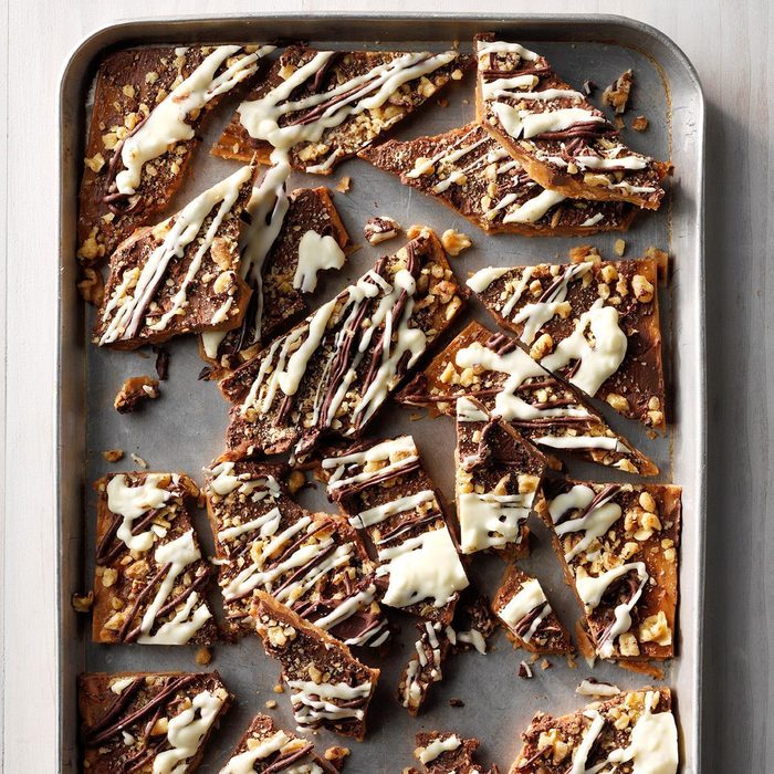 From the Recipe Creator: With its melt-in-your-mouth texture and scrumptiously rich flavor, this is the ultimate toffee! Layered on top are three kinds of melted chips plus a sprinkling of walnuts. Packaged in colorful tins, these pretty pieces make impressive gifts. —Lana Petfield, Richmond, Virginia