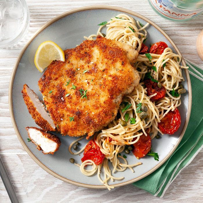 I love the combination of chicken and cheese in this chicken cutlet recipe. Parmesan cheese, garlic powder and onion powder flavor the golden chicken cutlet, which is coated with seasoned bread crumbs. —Marie Hoyer, Lewistown, Montana