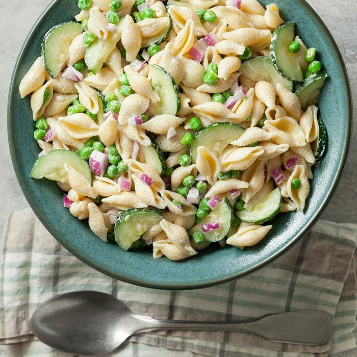 Ranch dressing is the mild coating for this pleasant pasta salad alive with the fresh flavors of crunchy cucumber, onion and green peas. Someone always seems to want the recipe! —Paula Ishii, Ralston, Nebraska