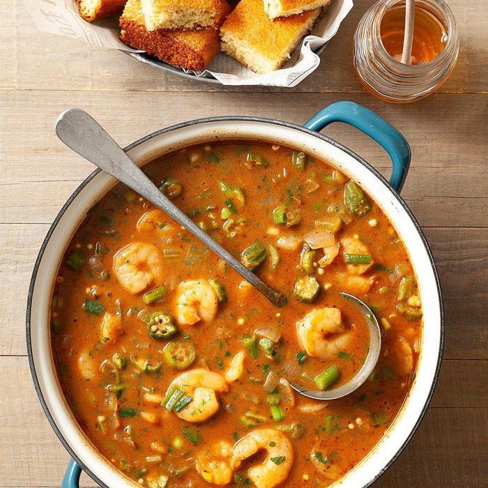 Gumbo is one of the dishes that make Louisiana cuisine so famous. We live across the state line in Texas and can’t seem to get enough of this traditional Cajun dish that features okra, shrimp, spicy seasonings and what is called the holy trinity—onions, green peppers and celery. This recipe calls for seafood, but you could also use chicken, duck or sausage. —Ruth Aubey, San Antonio, Texas