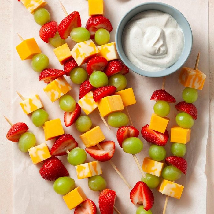 Bright, colorful and fun to eat, these fruit and cheese skewers turn lunchtime snacks into a rainbow-filled adventure. File this one under recipes kids can make themselves—they’ll love threading juicy grapes, sweet strawberries and cheese cubes onto sticks. Feel free to get creative with extra colors or your child’s favorite fruits, and be sure to include the cinnamon yogurt dip on the side to entice them to finish every bite.