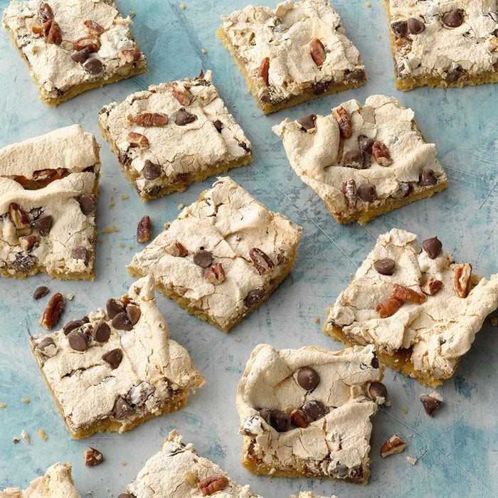 I've had recipes for chocolate chip cookies and pecan meringues in my collection for a number of years—and I combined them to make these bars! They're a lovely addition to any holiday cookie tray. —Dawn Lowenstein, Huntingdon Valley, Pennsylvania