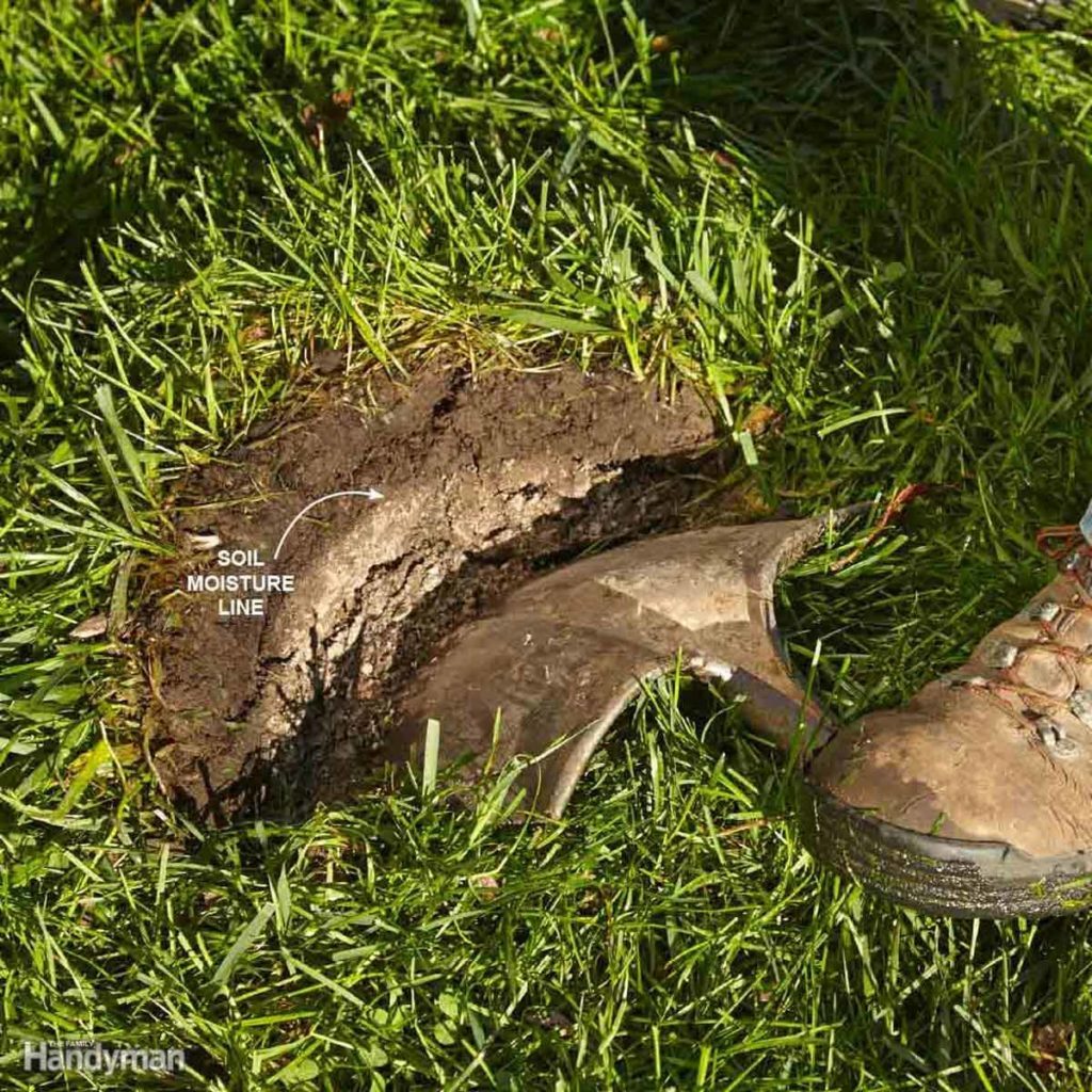 After an extended warm, dry period (dry soil is the key), set up your sprinkler and set a timer for 30 minutes. Then turn off the water and check the soil for moisture depth. Do this by pushing a shovel into the lawn and tipping it forward to expose the soil. See how deep the water has penetrated. Moist soil will be darker. Your goal is to run the sprinkler until the water penetrates three to four inches into the soil.