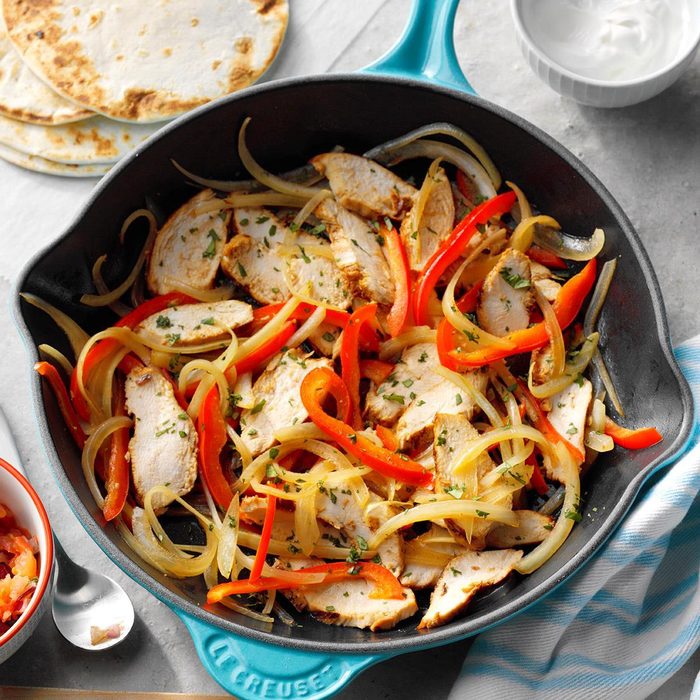 This chicken fajitas recipe is definitely on my weeknight dinner rotation. The marinated chicken in these popular wraps is mouthwatering. The fajitas go together in a snap and always get raves! —Julie Sterchi, Campbellsville, Kentucky
