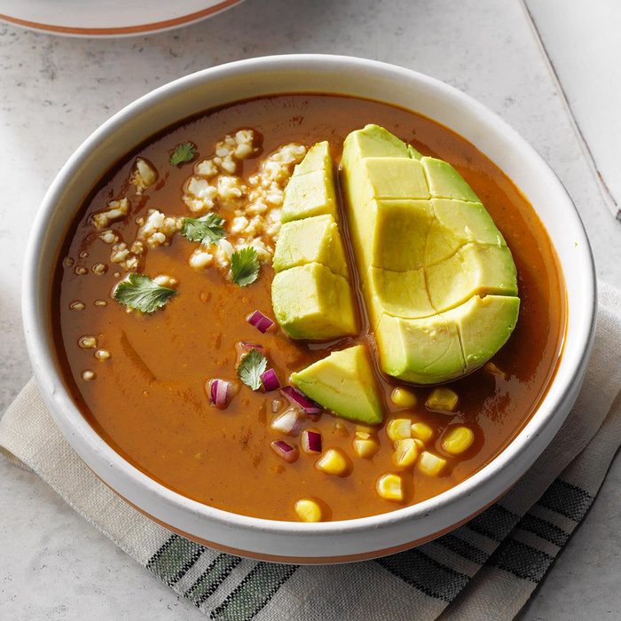 This aromatic pork stew, also known as pozole, is a southwestern delicacy. I make it in the slow cooker so it can simmer away on its own. The rich, brothy soup is delicious, much like a tamale in a bowl. —Joan Hallford, North Richland Hills, Texas