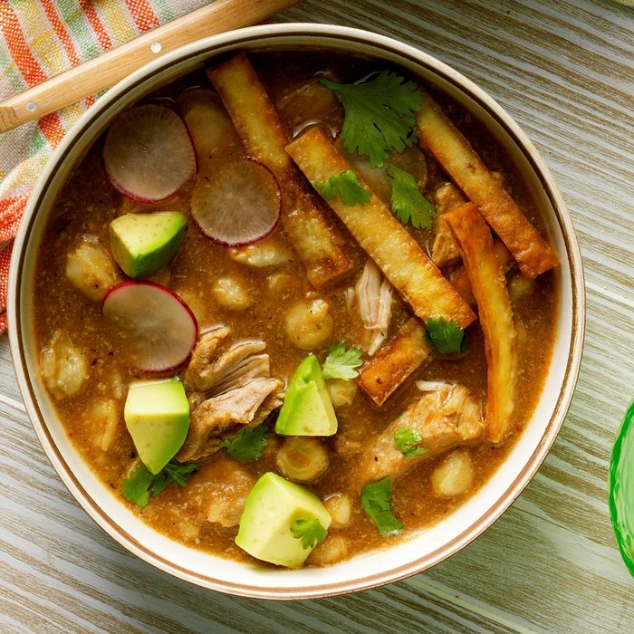 This pork hominy stew, also known as pozole, is a delicious southwestern delicacy. I moved it to the slow cooker so it can simmer away on its own. The rich, brothy soup is delicious, much like a tamale in a bowl. —Joan Hallford, North Richland Hills, Texas