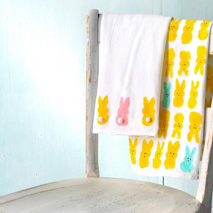 Put those Peeps to work! Take advantage of the sweet haul the Bunny brings with this adorable tea towel craft. Get started by laying out a clean, white flour sack towel. Then, unwrap a package of Peeps candies and coat a few of ’em in Mod Podge. Once the candies are dry, the fun can begin. Dip the Peeps in fabric paint and lightly press down on the towel. Repeat, as needed, to create your desired pattern. Finish by hot-gluing mini pompoms on for tails or using a fabric pen to draw faces. Check out these other fun ways to use up leftover Easter candy.