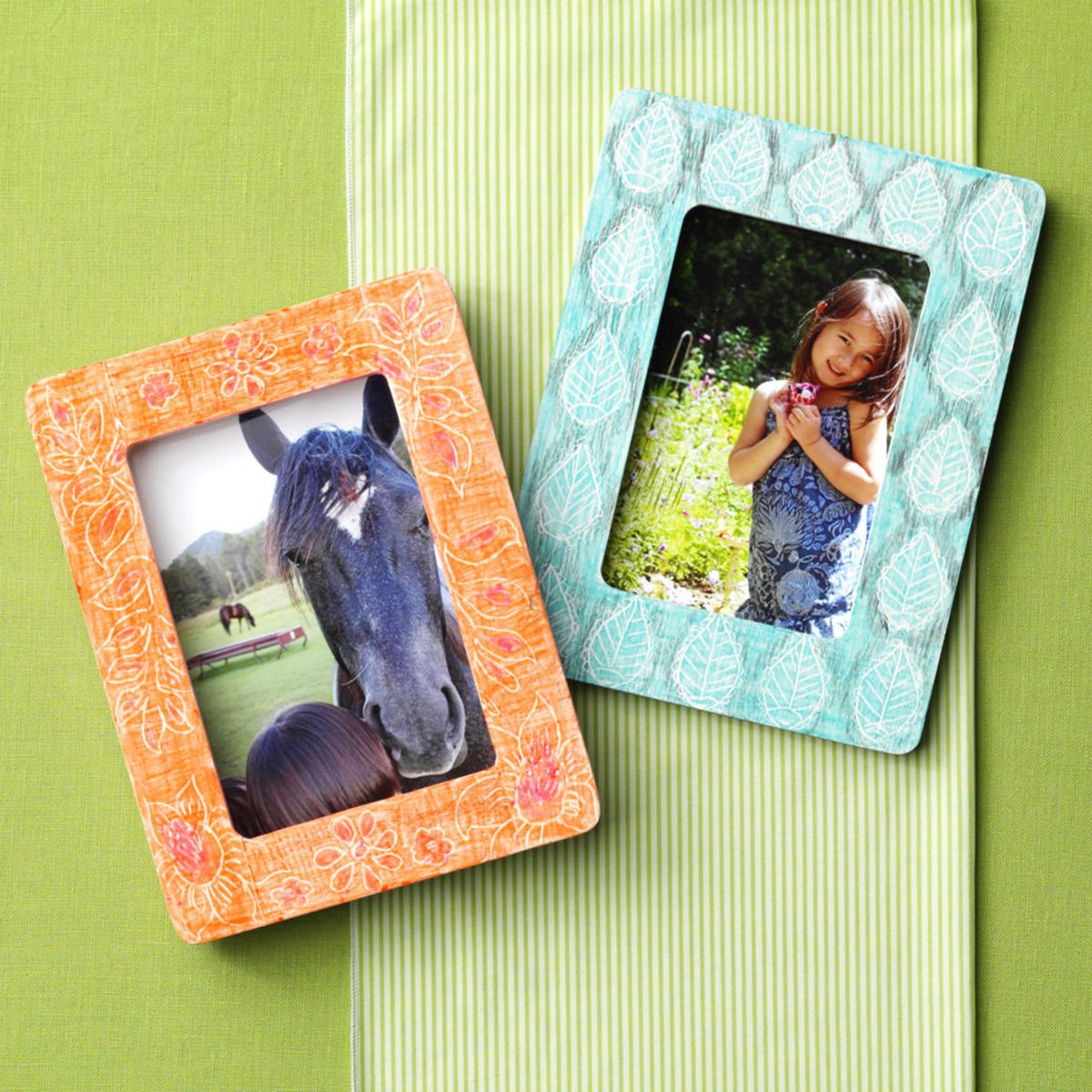 Upgrade a plain wooden craft frame with this fun technique. First, decide on a design for your frame. It can be as simple or elaborate as you’d like! Then, use a knitting needle to etch the design into the wood frame. (Parents will definitely want to supervise younger kids during this step!) Then, gently color the frame with a crayon. We suggest coloring vertically, then going over the frame horizontally, too. Dust off any crayon residue, then use a hair dryer to set the colors.