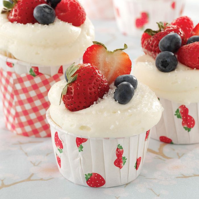 Guests just love these yummy white cupcakes that are topped with a cream cheese frosting. The strawberry-blueberry garnish makes them the perfect treat for a patriotic-themed party on Memorial Day or Fourth of July. —Judy Kenninger, Brownsburg, Indiana