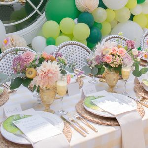 Cool as a cucumber…but cute as a kiwi! That’s what this layout feels like. Use a pastel gingham tablecloth as the base for natural woven chargers, fruit-inspired place settings and a bevy of beautiful blossoms (dotted with kiwis, of course). Finish your table with utensils in classic gold.