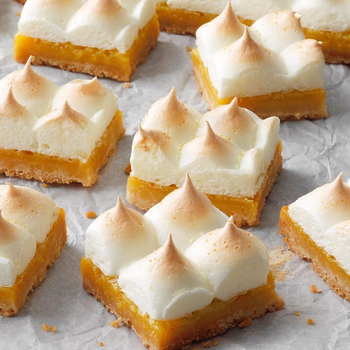 From the Recipe Creator: We have a prolific lemon tree in our backyard and are forever trying to find new ways to incorporate lemons into our culinary endeavors. My daughter, Audrey, knows my love of all things sweet and decided to test her baking skill by combining two of my lemony favorites: lemon bars and lemon meringue pie. After hours in the kitchen, these delicious lemon meringue bars were born. —Monica Fearnside, Rancho Palos Verdes, California