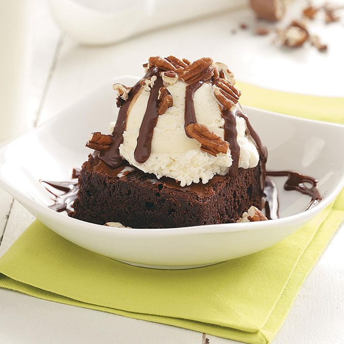 Cap off dinner with these Brownie Sundaes. With prepared brownies, I can fix this sweet treat in a flash. For extra flair, I roll the ice cream in pecans before placing them on top of the brownies. It's a perfect finish to a mouthwatering meal. —Ruth Lee, Troy, Ontario