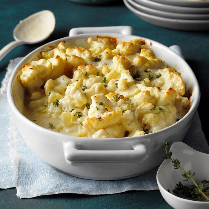From the Recipe Creator: Cauliflower gratin is a lower-carb side dish that will balance out your Thanksgiving table. It’s so creamy and delicious that even the kids will ask for seconds! If you like a little crunch, sprinkle buttered bread crumbs over the top for the last five minutes in the oven. — Mary Zinchiak, Boardman, Ohio