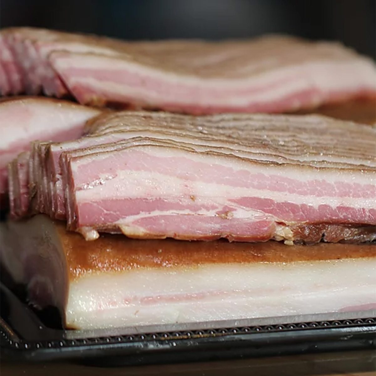 The Pine Street Market is proud to be a whole animal butchery that uses every part of the animals. Their Heritage Bacon is made with pork bellies from Duroc hogs, a breed chosen by the butchers for the exceptionally juicy and flavorful meat. The bellies are smoked in applewood and oak.