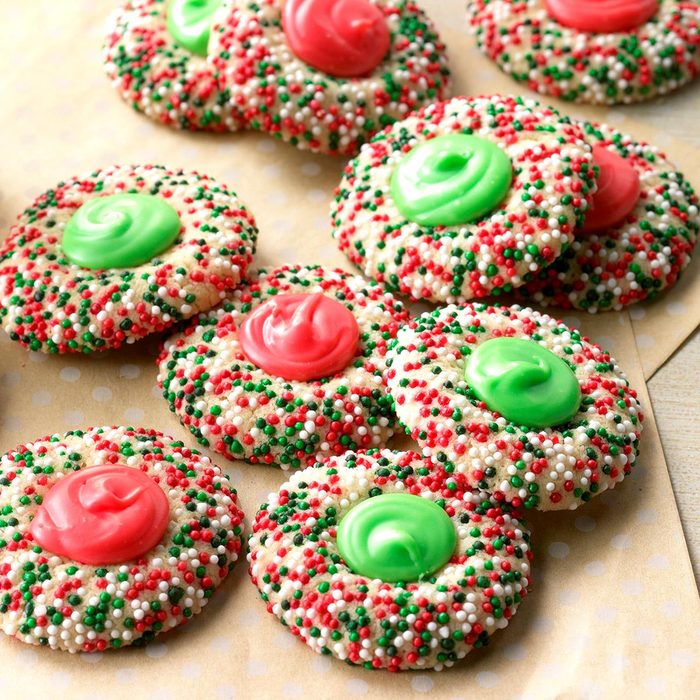 These buttery little rounds add beautiful color to a platter of treats. Fill the thumbprint in the center with any fruit preserves you like. —Taste of Home Test Kitchen